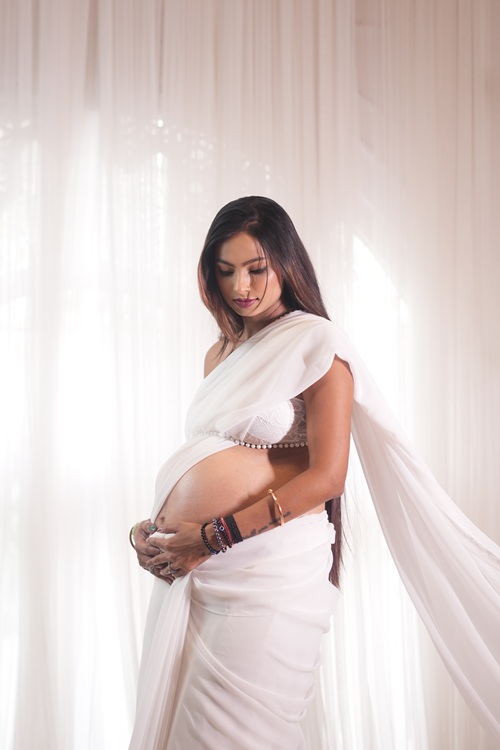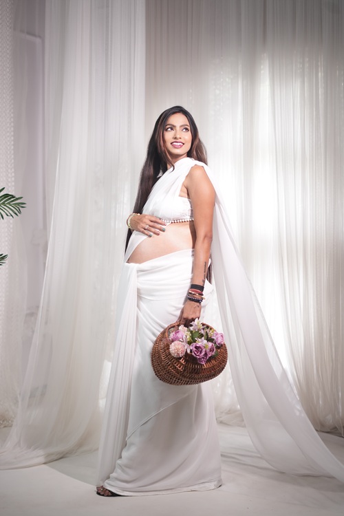 The saree, a symbol of grace and femininity, perfectly enhances the natural beauty of a mom-to-be. Draped softly around the baby bump, it creates a dreamy and emotional frame—reflecting the love between mother and child. Whether you choose pastel hues, soft chiffon, or royal silk, every saree tells your story in its own way. ✨
